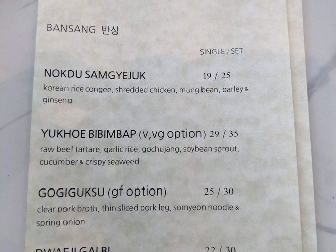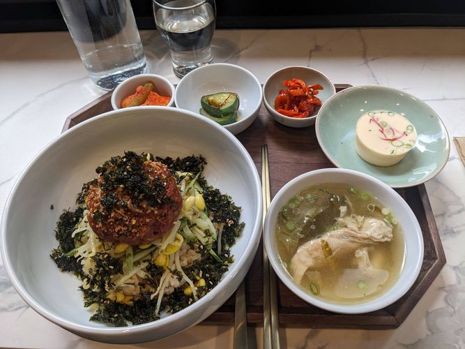 bibimbap had less gochujang than I expected. Chicken soup felt like a nice palate cleanser. Overall tastes alright although expensive