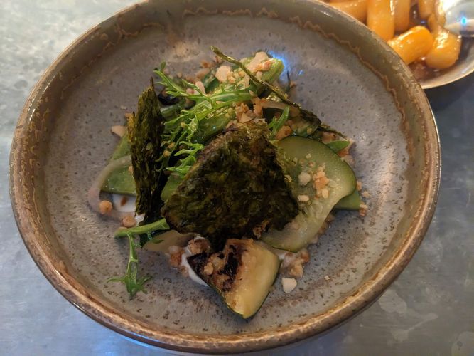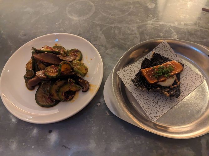 nori cracker with seared tuna. On the left is szechuan pickled veggies